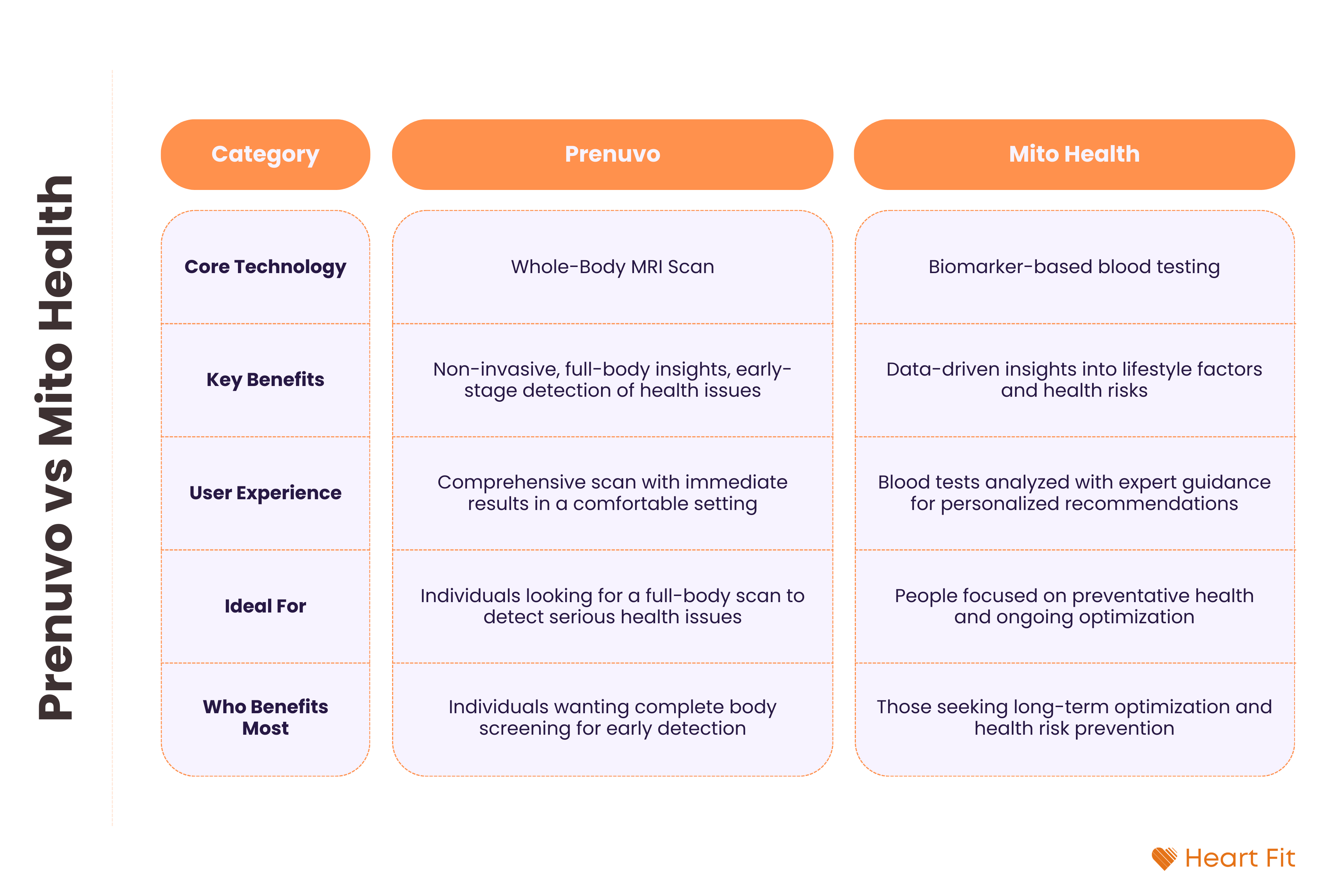 Feature Prenuvo Mito Health Core Technology Whole-Body MRI Blood & Biomarker Analysis, Primary Goal: Detect structural abnormalities, Assess functional & metabolic health. Key Insights: Cancers, aneurysms, cysts, Disease risk, inflammation, nutrition. Best For: Early detection of physical issuesHealth optimization & longevity